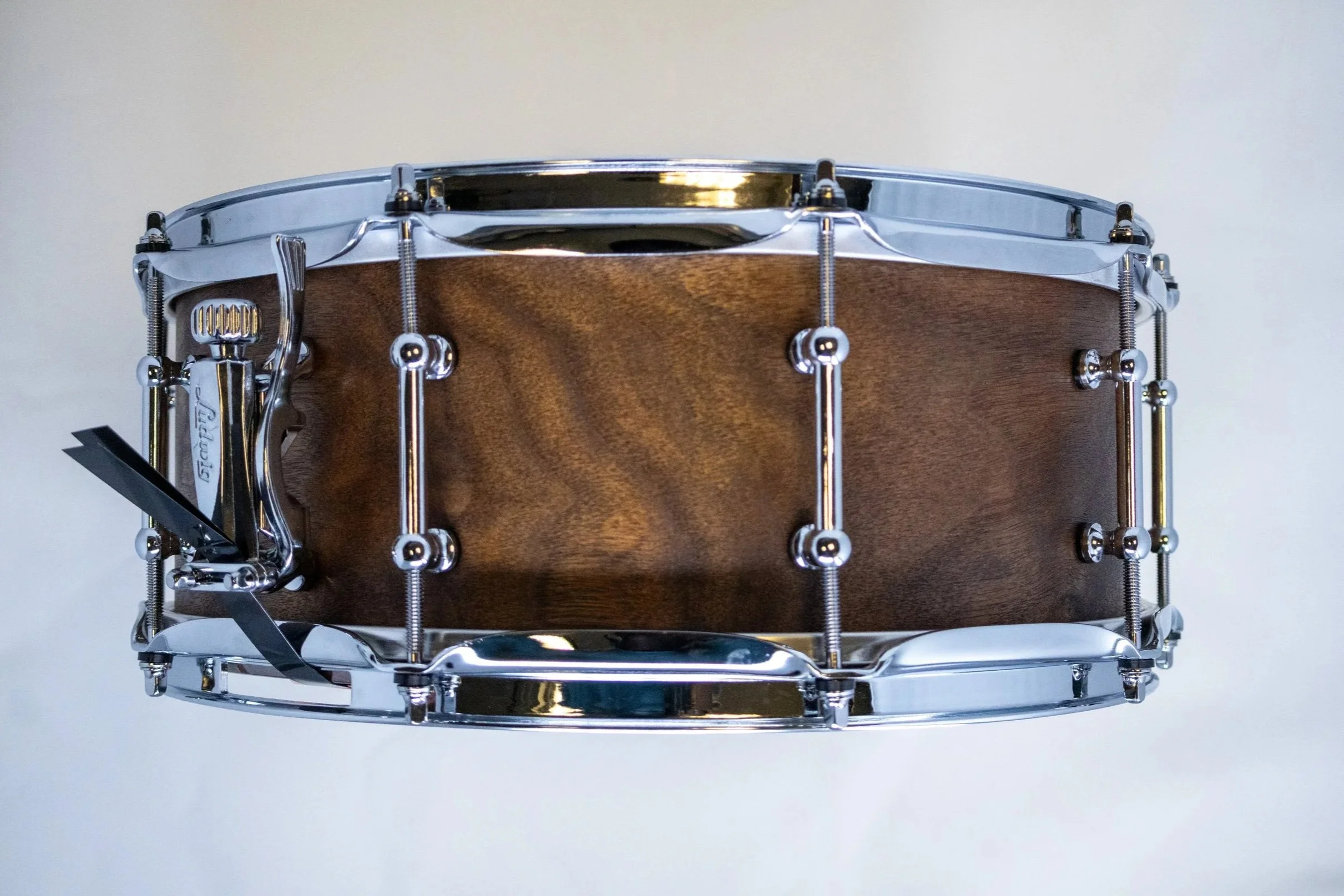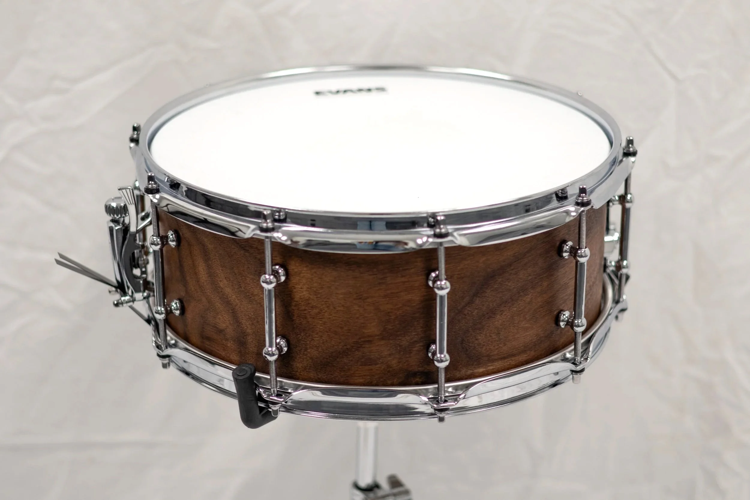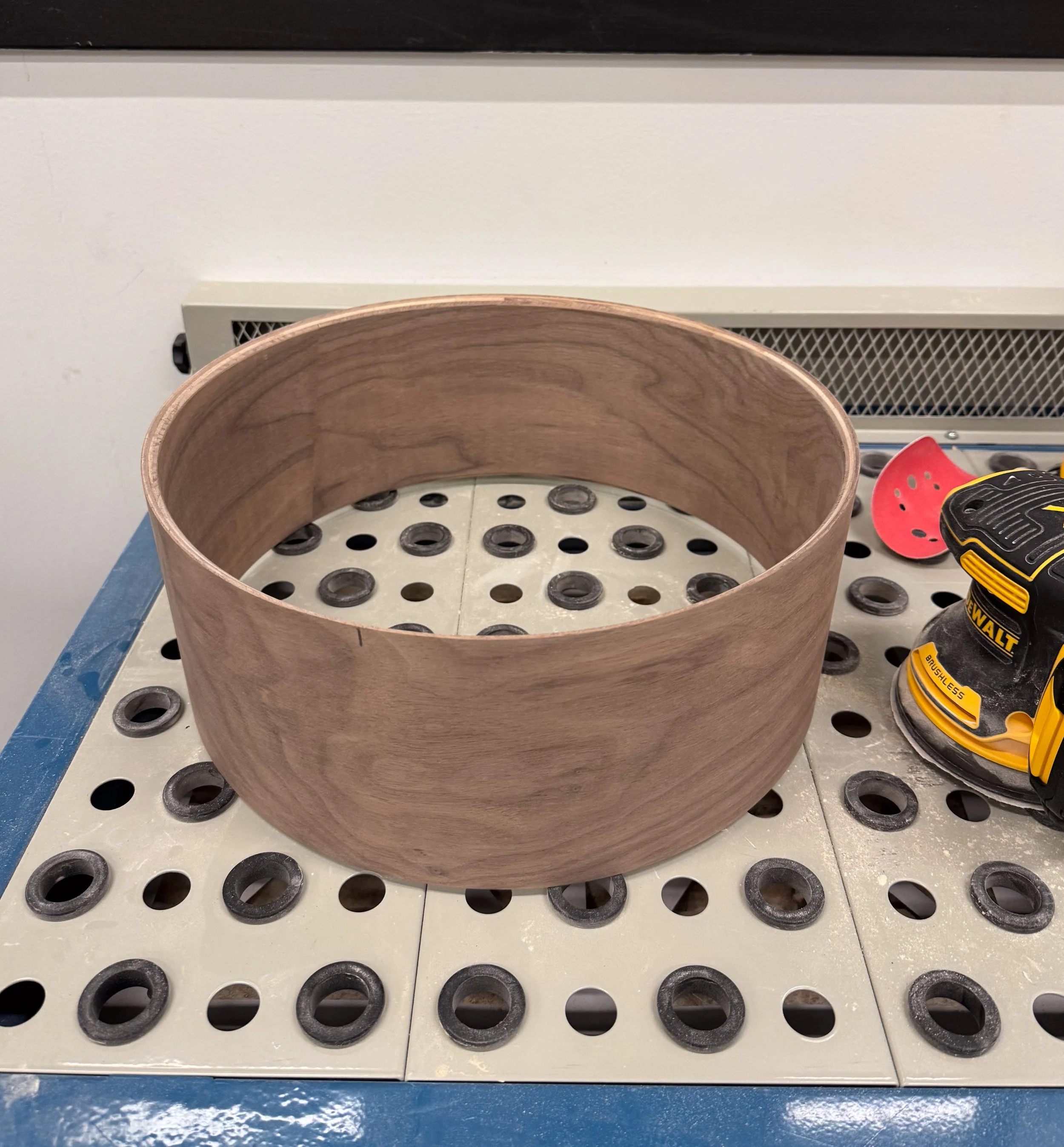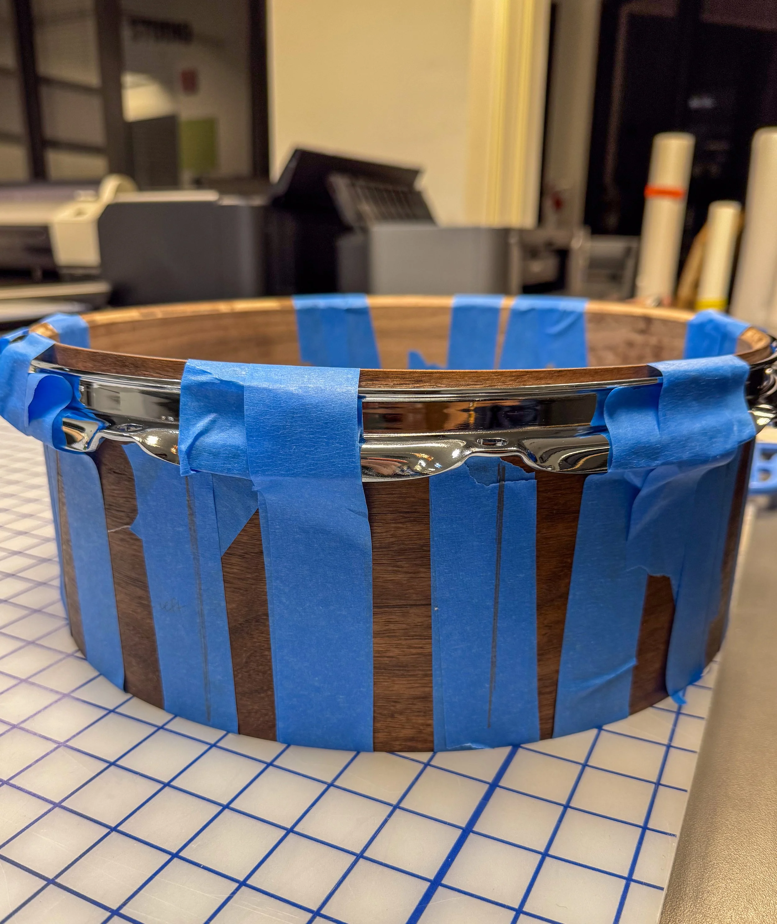I completed this as a personal creative project at the Creative Media Center, described in my About section. I constructed the drum using a 5.5” x 14” 6 ply walnut shell, which I finished with a few coats of teak oil. I prepared the shell with multiple rounds of sanding, a little bit of water to open the grain, and a very small amount of shellac, after which I applied the finishing oil. To minimize imperfections and ensure a uniform shell, I made sure to thoroughly clean and lightly sand/scuff to smooth the shell in between each step.