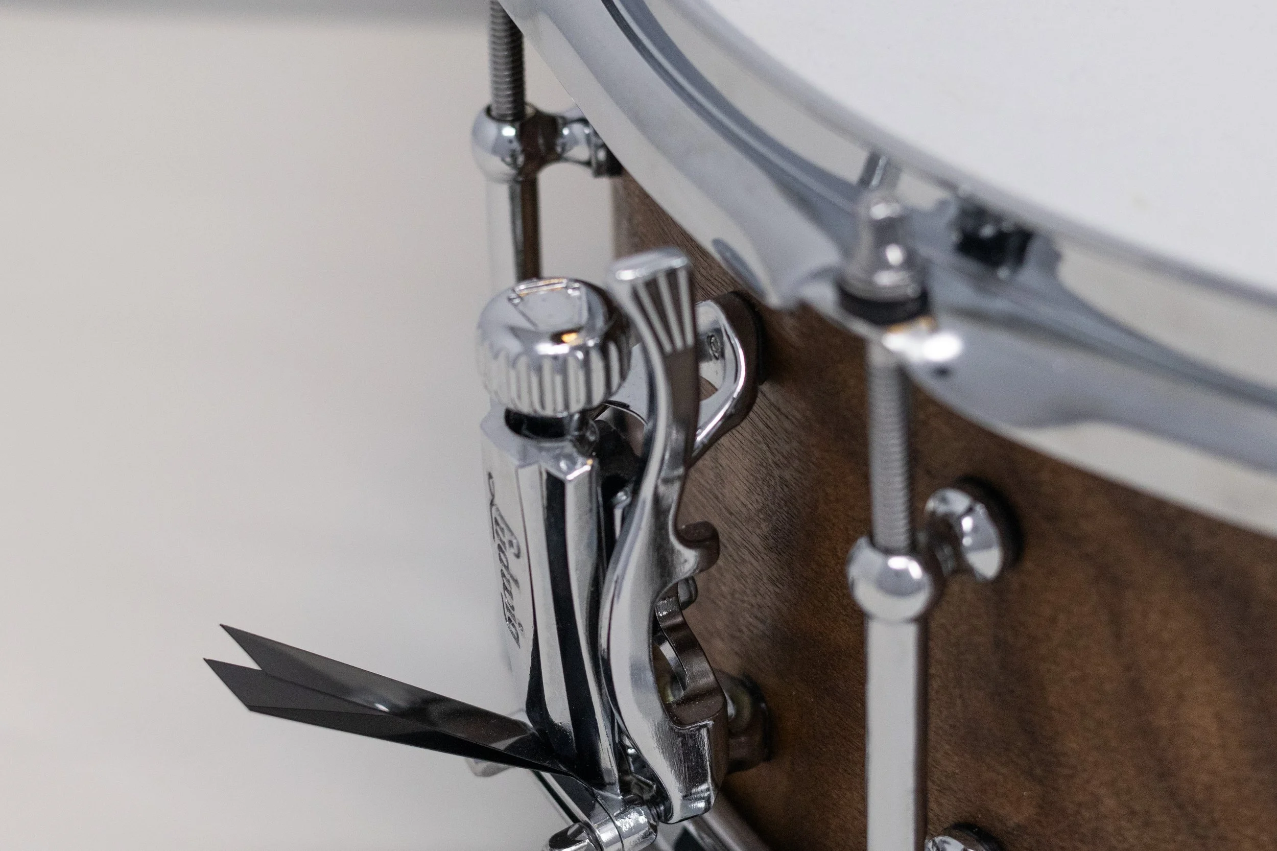 Finally, I began the assembly process by cleaning the drum to remove any dust produced by the drilling. I finished the process by placing the two heads (Evans G12 Snare Batter and Evans Snare Side 300 drumheads), triple flange hoops, the tension rods, and Evans PureSound Custom Pro Brass Snare Wire.